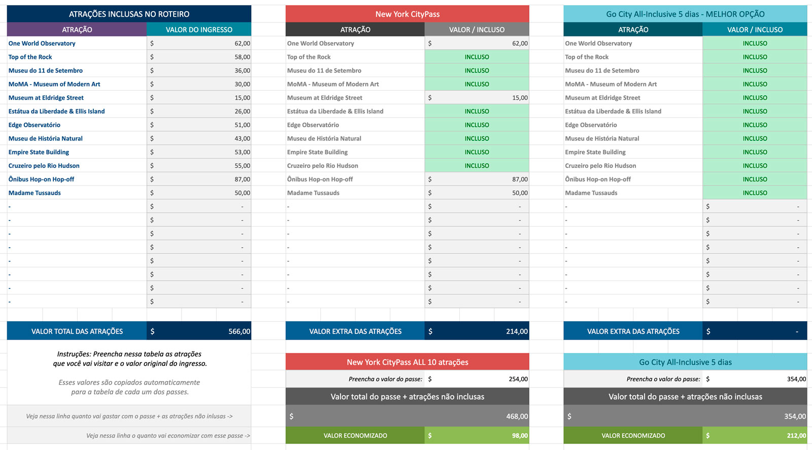 Sempre digo aqui no blog que sou o louco das planilhas – para tudo, eu abro uma tabela e começo a fazer meus cálculos. Com os passes de atrações em Nova York, não foi diferente!